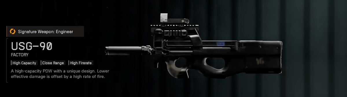 The USG-90 (P90) is the spray-and-pray specialist. A 50-round mag and ~900 RPM let Engineers clear rooms and hold objectives without pausing to reload. Lower per-shot damage limits it past close range, but sheer volume and easy hipfire make it incredibly forgiving.