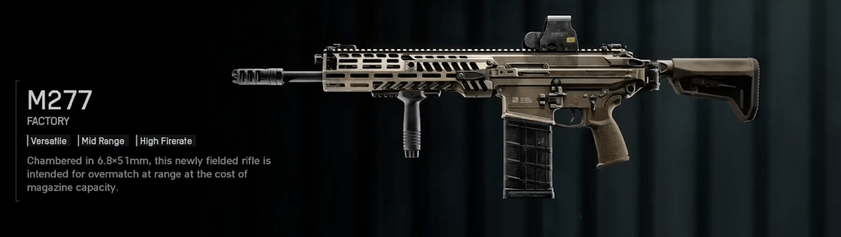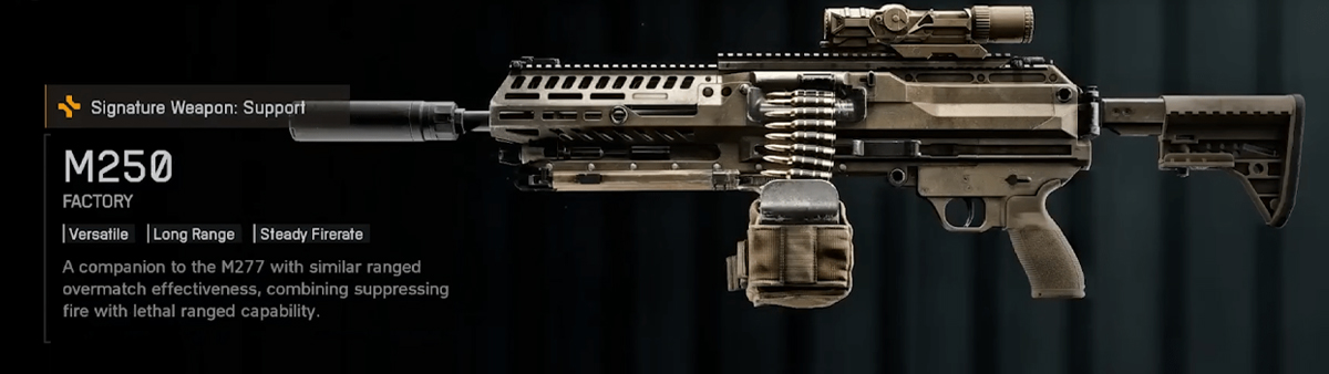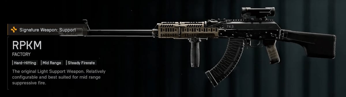 The aggressive LMG. High fire rate plus a 100-round belt make it perfect for pushing objectives and suppressing corners. Long-range consistency suffers, but inside mid range it floods zones with pressure.