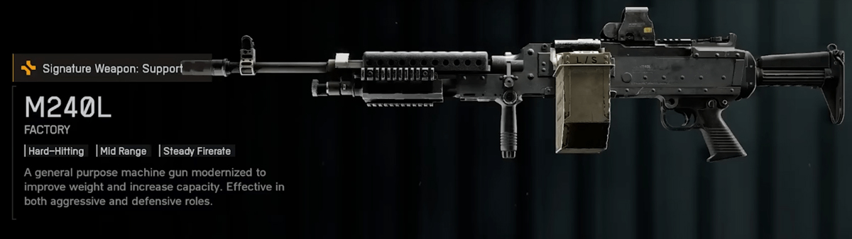 A modernized GPMG built for sustained fire. Huge belts, steady accuracy, and controllable recoil make it excellent for overwatch and defensive anchors. Slower handling is the trade, but when you need lanes locked, the M240L delivers.