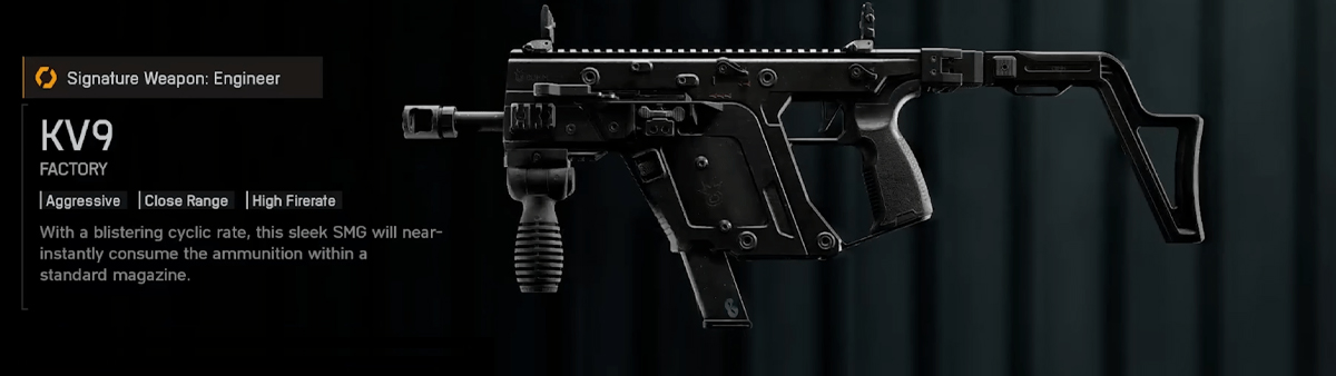 The KV9 is an aggressive, close-range, ammo-hungry SMG. Firing at 1080 RPM, it boasts the fastest rate of fire in its class and erases targets in tight corridors. The trade-off is a small 27-round magazine, so reloads are frequent and punishing if mistimed. Master your positioning and timing, and it becomes a close-quarters terror.