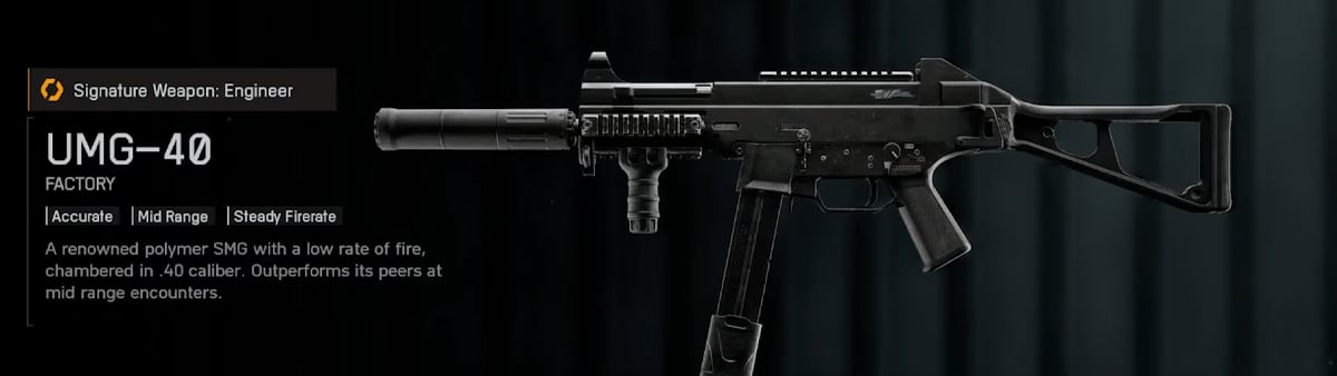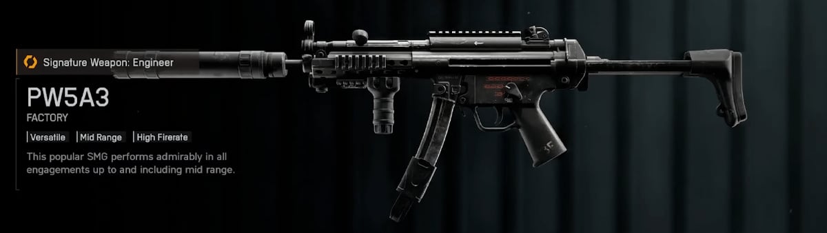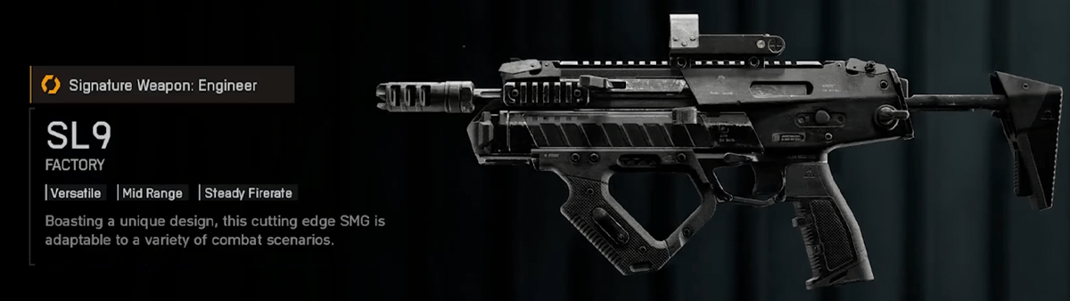 A control-first SMG. At ~635 RPM it’s slower than peers, but tighter accuracy and manageable recoil let it contest longer lanes better than most PDWs. Not ideal for frantic CQB, great for measured Engineer play.