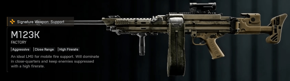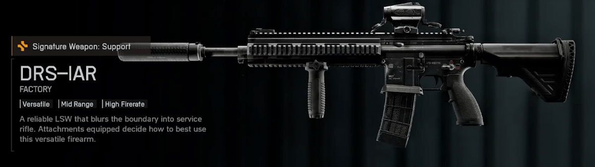 The DRS-IAR is a lightweight LMG built for sustained, accurate fire without the usual anchor-down penalty. Think rifle-like ADS speed and recoil with LMG-grade suppression and magazine capacity. It steadies sightlines, chews through pushes, and shines when you’re escorting the squad. Capable on the move, lethal when you post up and let the barrel sing!