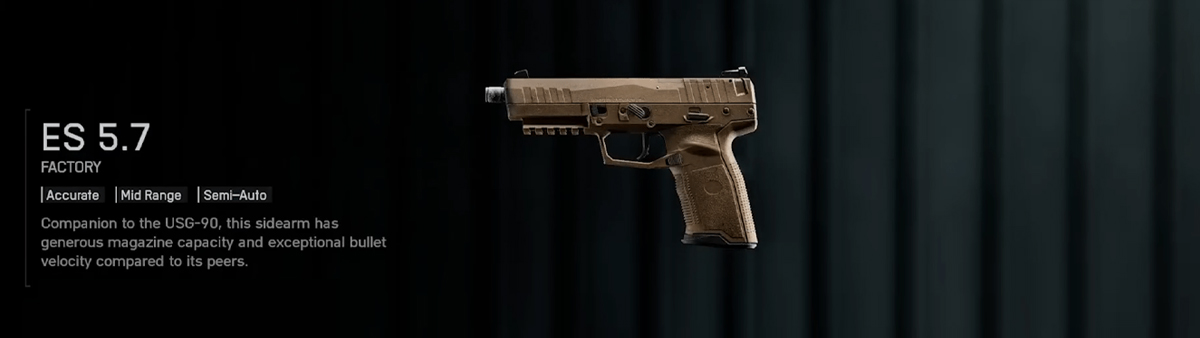 The ES 5.7 leans on a capacious 20-round magazine and a snappy 450 RPM to keep rounds flowing when your primary runs dry. Each shot only hits for 20, but the flat recoil and quick follow-ups stack damage fast, making it nasty in tight quarters. Accurate, forgiving, and easy to chain into headshots, it’s the sidearm you pick when consistency matters.