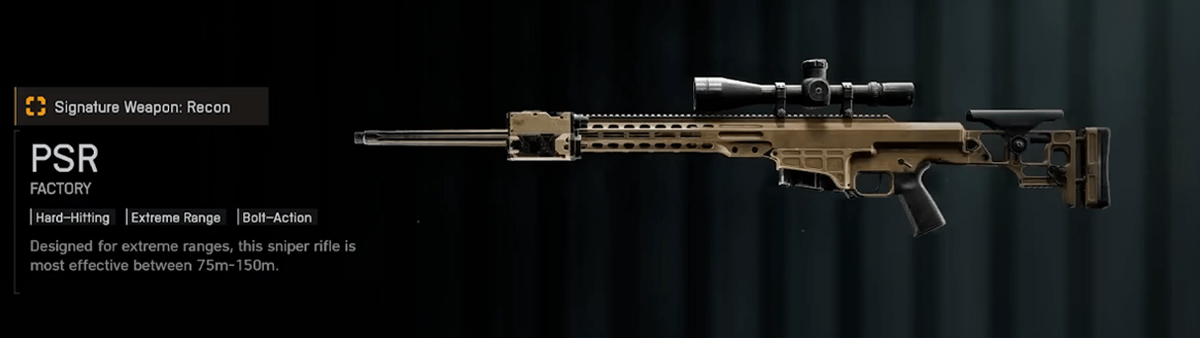 The PSR is a purpose-built extreme-range monster. It hits for 100 a shot with razor-sharp accuracy and the longest effective reach on bigger maps, which is perfect for locking down wide sightlines and punishing peeks. But there are also trade-offs: a 7-round mag and very slow handling. In the hands of a patient and dedicated Recon, though, nothing comes close to it (literally).