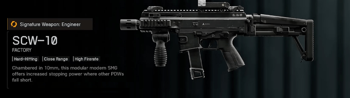 The SCW-10 perfectly blends stopping power with pace. At 33 damage per shot and 800 RPM, it delivers one of the best TTKs in the SMG category. Recoil is snappy, but rewards steady burst control and good tracking. For Engineers who want stronger dueling potential without sacrificing mobility, it’s a rock-solid hybrid pick.