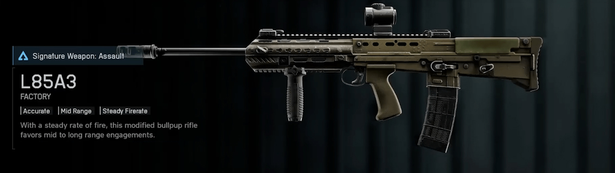 The L85A3 is all about steadiness and discipline. With excellent recoil control (62) and solid precision (42), it lasers mid to long lanes while the 36-round mag keeps you in the fight. Its modest 635 RPM and low mobility (36) hold it back in frantic close quarters, but as a posted anchor or support rifle, it’s a dependable A-tier pick.