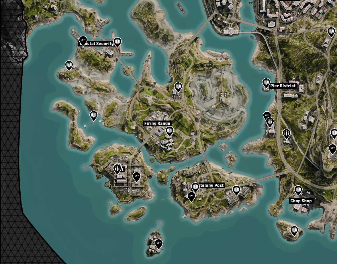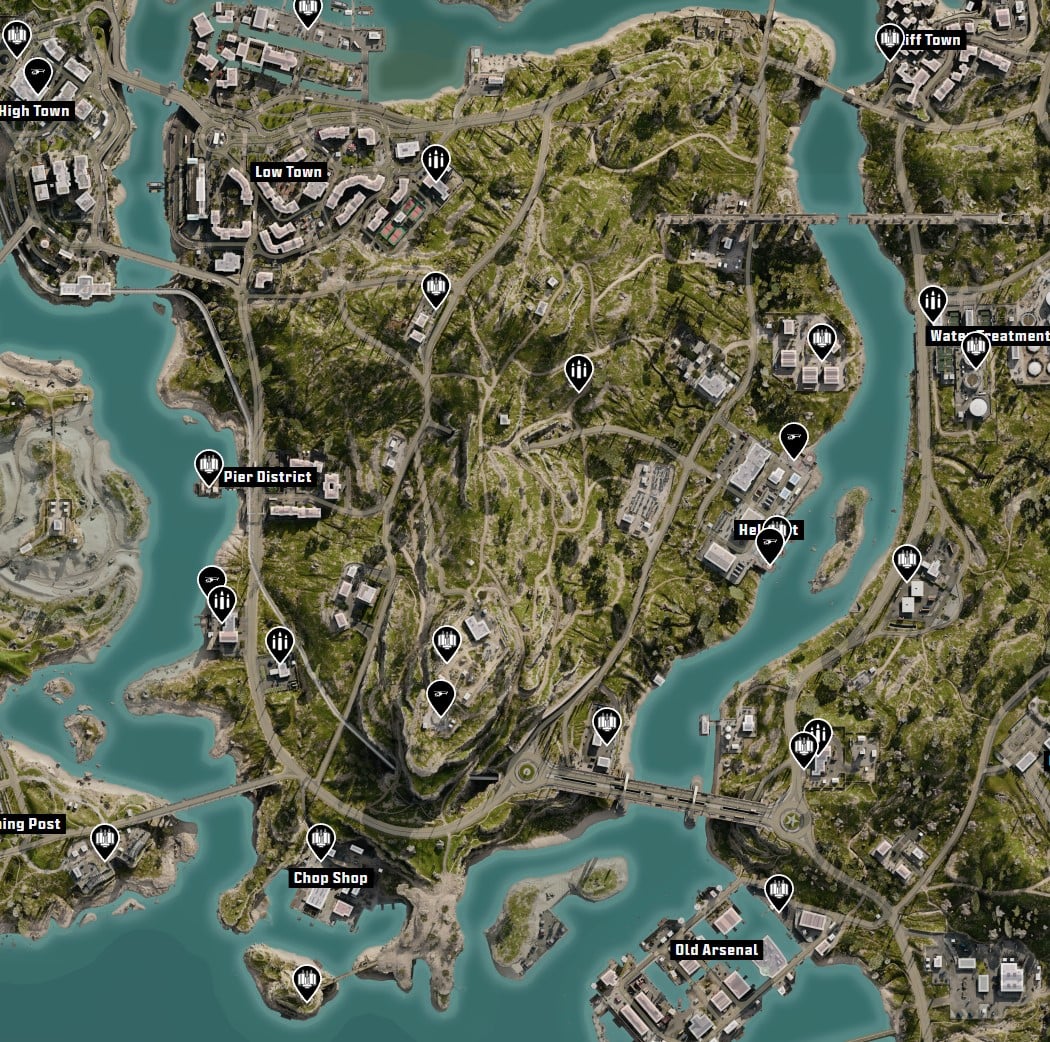 The East and Southeast blend two different map identities. Cliff Town is more vertical, old, and packed with ambush angles. Water Treatment, Car Factory, and Old Arsenal are flatter, more industrial, and easier to read at a glance; they look like classic Warzone locations.