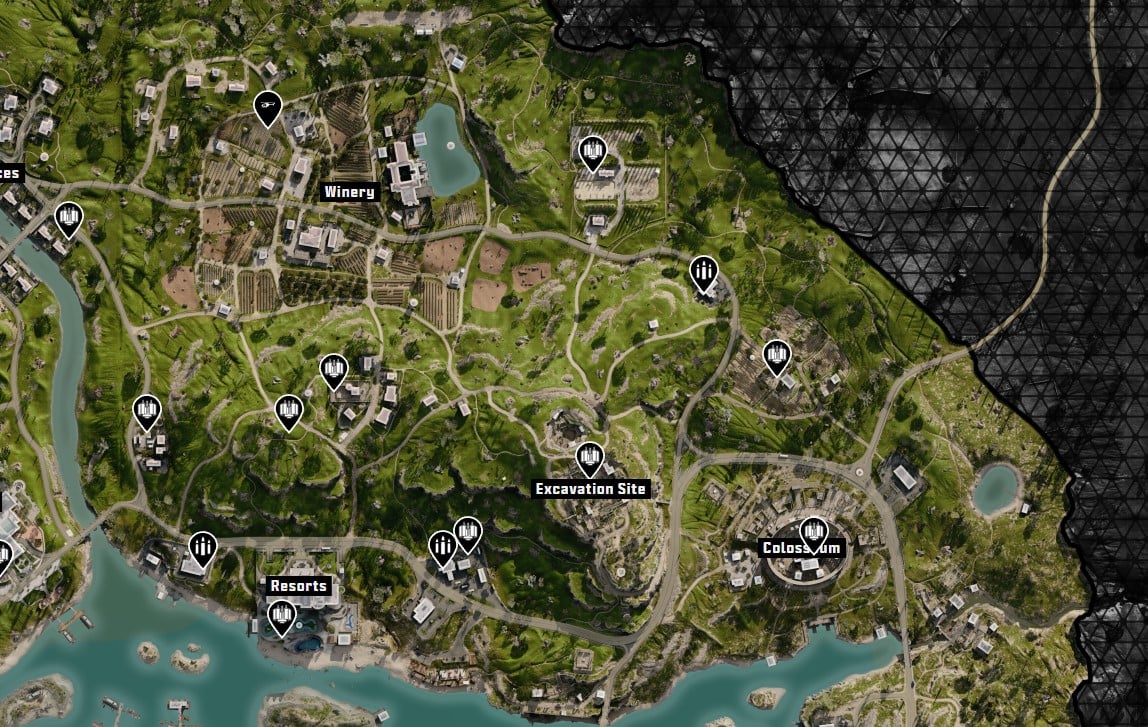 The Northeast is more of an open terrain style region with Winery, Resorts, Excavation Site, and Colosseum being the major POIs.