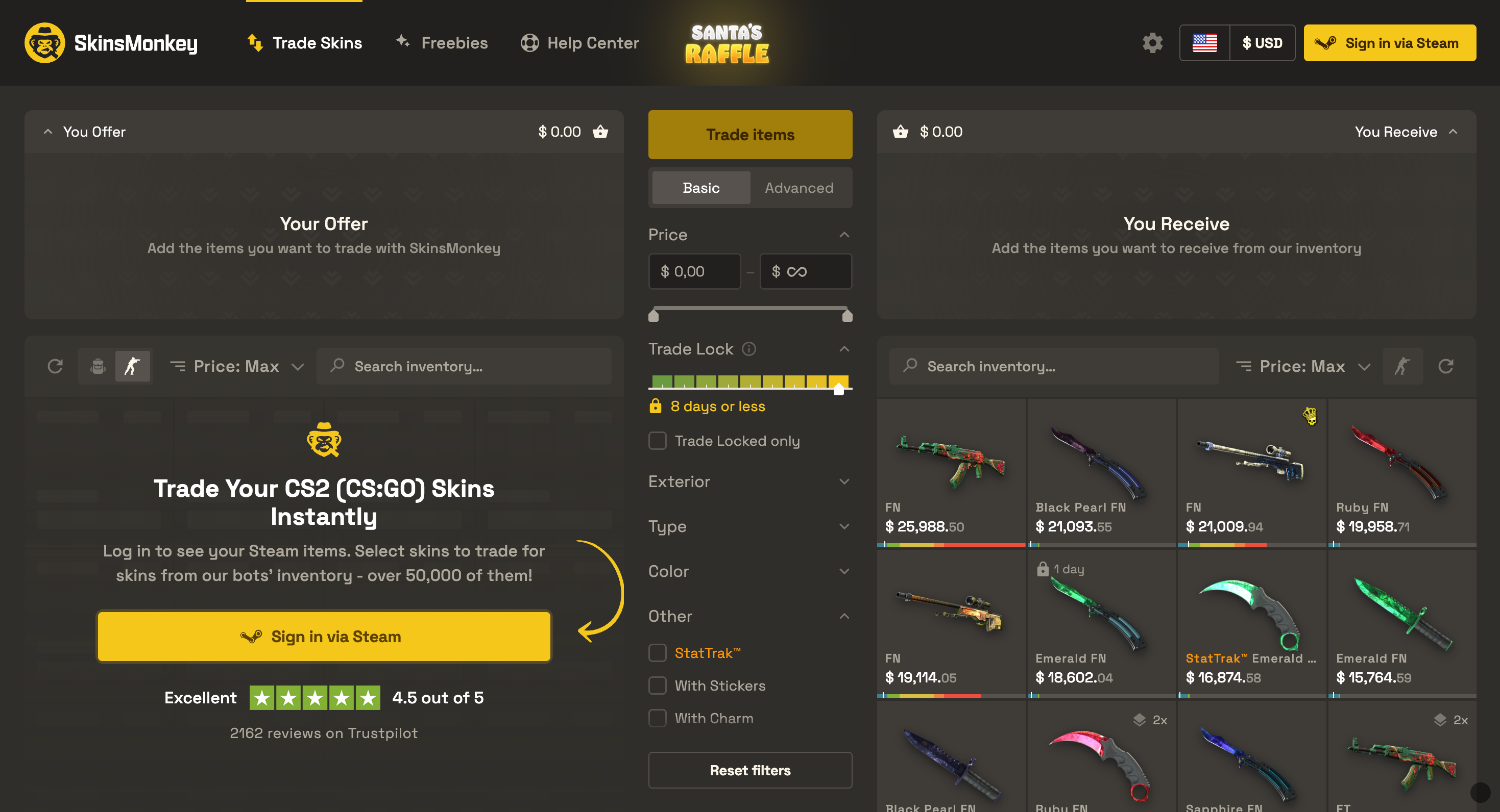 SkinsMonkey takes the last place in our ranking. It is built mainly around instant trades rather than a clean marketplace feel. That approach can be convenient, but it usually comes with a clear tradeoff. Value often feels worse than on other platforms. You give up more skins to get the one you want. Prices can feel inflated once you compare them side by side.