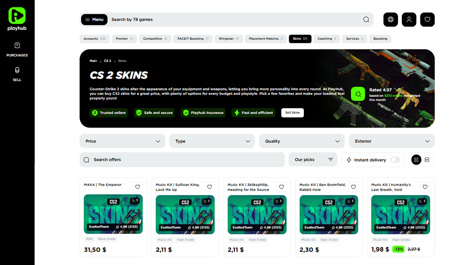 Playhub is the best website to buy CS2 skins in 2026. Despite being a relatively new platform, it has everything you can possibly think of. Listings are easy to read, prices feel transparent, and there is no guessing about what happens after purchase. The site avoids clutter and keeps the focus on smooth skin transfers. That alone removes a lot of friction.