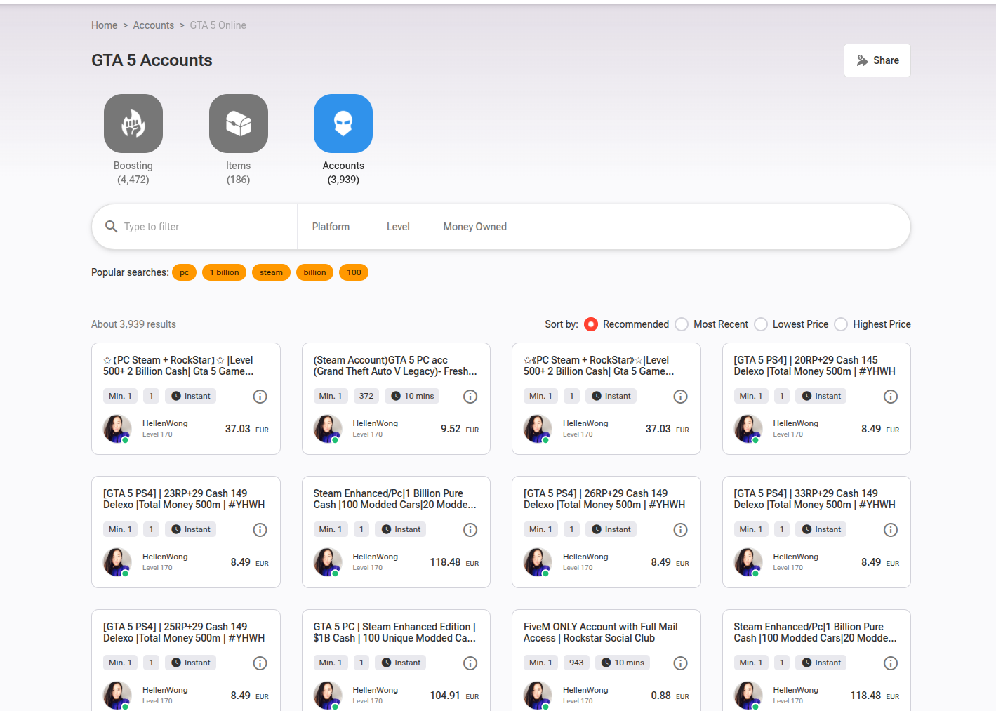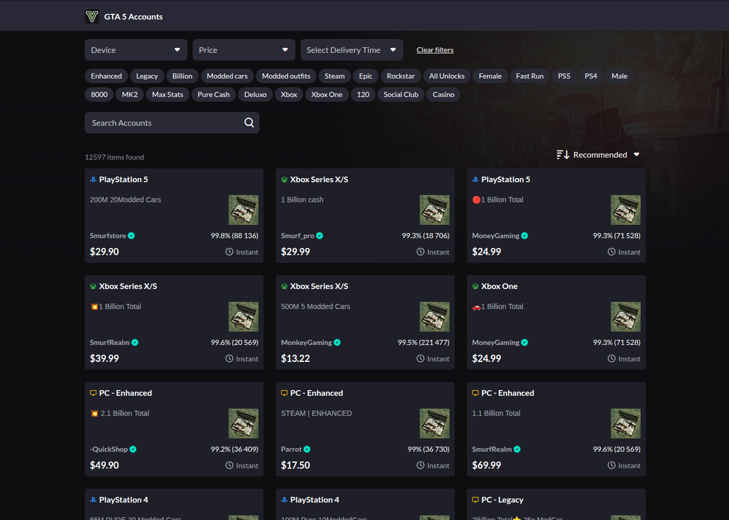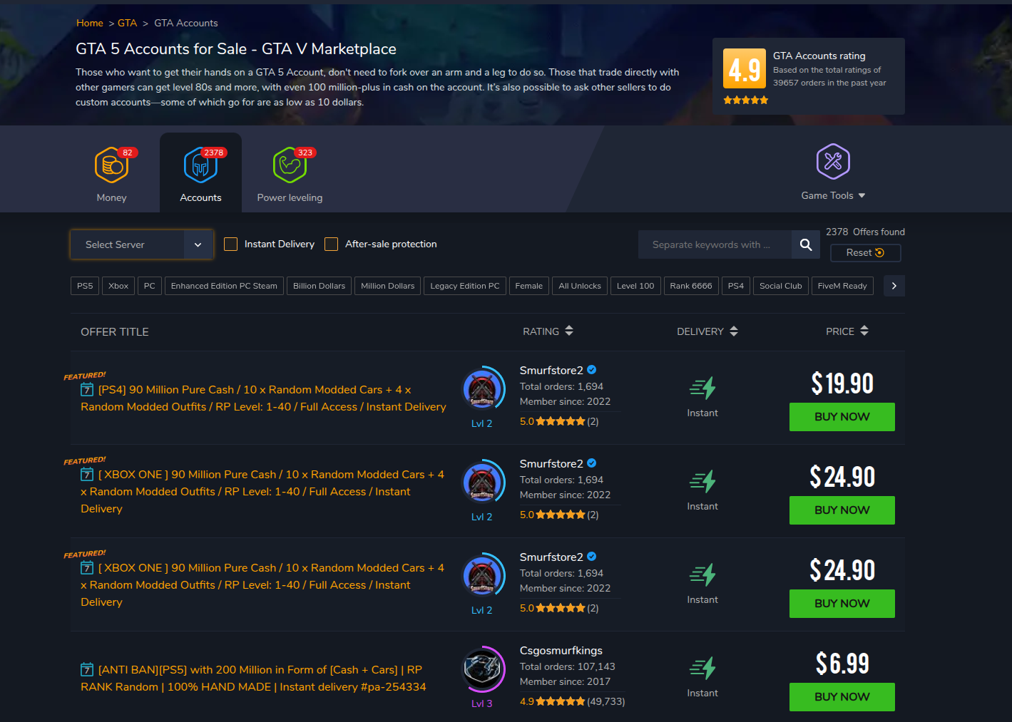 - Massive GTA 5 catalog - Filter by platform (PC, PS4, PS5, Xbox), rank, money, and specific vehicles.